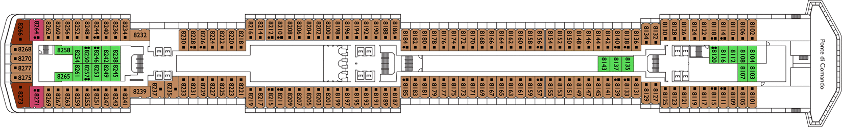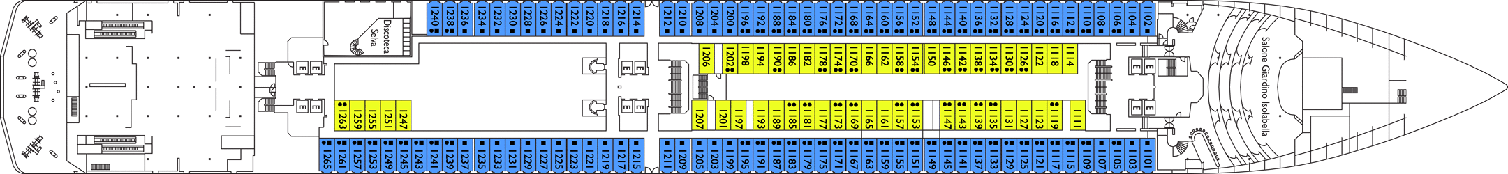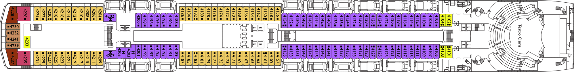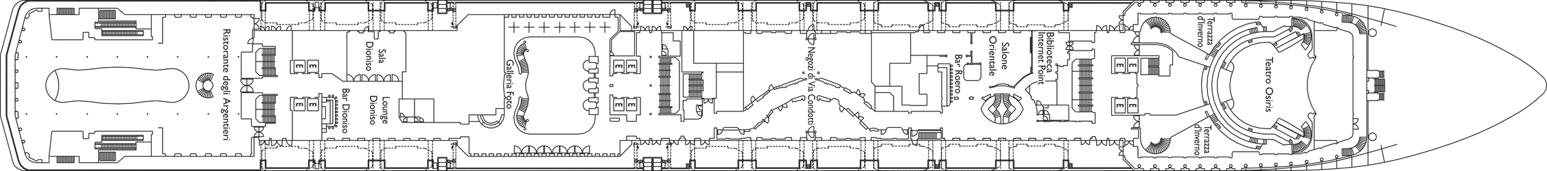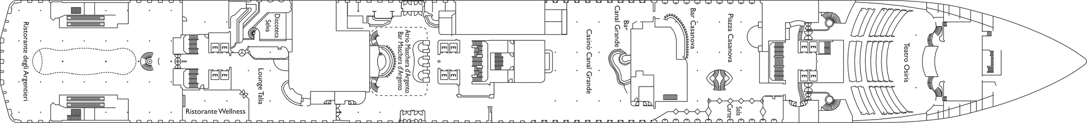In questo palazzo galleggiante, tutto è pensato per farti scoprire l'eleganza e la bellezza senza tempo dei palazzi e dell'arte italiana, soprattutto tramite la sua galleria. Per far sì che le tue serate a bordo siano piene di esperienze meravigliose, la nave ti offre una vasta gamma di luoghi di intrattenimento come il Teatro Osiris. Disposto su tre livelli, sui ponti 2, 3 e 4, permette di assistere a magnifiche performance di artisti internazionali, il tutto in un ambiente ispirato direttamente allo stile egiziano. Se per divertirsi, i nottambuli che viaggiano sulla nave si dirigono verso il locale notturno Selva, i giocatori troveranno la loro felicità al Casinò Canal Grande, sul ponte 2.