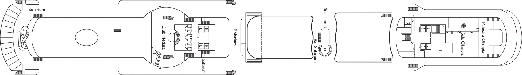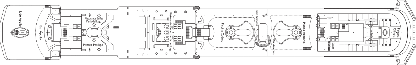 L'imbarcazione offre ai suoi crocieristi tre piscine con un'area confortevolmente attrezzata, tra cui il Lido Apollo ubicato nella parte posteriore della nave, che offre una vista mozzafiato sul mare e sulle scie della nave. La piscina centrale Cadmo è dotata di un tetto di vetro retrattile, che permette ai passeggeri di praticare sport acquatici con qualsiasi condizione atmosferica. Numerose vasche idromassaggio sono disponibili anche a bordo dell'imbarcazione per coloro che vogliono rilassarsi tranquillamente e godere dei loro benefici terapeutici. I bambini e gli adolescenti saranno deliziati dal super scivolo che si affaccia sulla piscina a cielo aperto.
