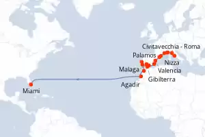 Itinerario : Civitavecchia - Roma, Firenze/Pisa (Livorno), Monaco Monte-Carlo, Nizza, Marsiglia, Palamos, Barcellona, Valencia, Cartagena, Malaga, Gibilterra, Siviglia, Lisbona, Portimao, Casablanca, Agadir, Miami