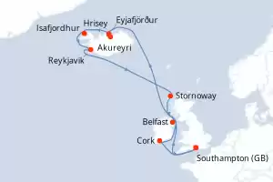 Itinerario : Southampton, Belfast, Hrisey, Eyjafjordur, Akureyri, Isafjordhur, Reykjavik, Stornoway, Cork, Southampton