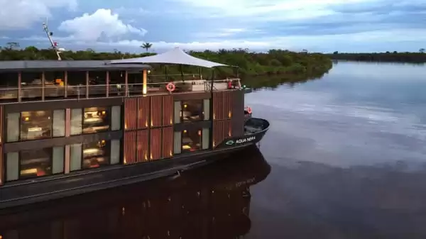 Progettata dallo studio Studio Noor a Ho Chi Minh City, la Aqua Nera si ispira alle lagune di acqua nera amazzoniche e gioca con eleganza sui contrasti tra ambienti soffusi e tocchi di artigianato peruviano, spagnolo e portoghese. Lunga oltre 62 metri, questa nave dal design contemporaneo e dalle linee essenziali presenta una silhouette elegante, pensata per navigare con facilità nei meandri profondi e poco esplorati dell’Amazzonia peruviana. L’arredamento interno, sobrio e sofisticato, rende omaggio alla ricchezza culturale della regione con richiami ai motivi tradizionali shipibo-conibo, alle piastrelle di Iquitos e all’uso di materiali nobili.