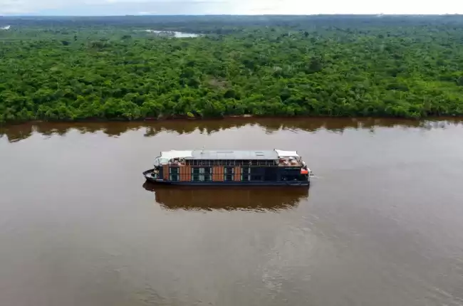 Le sue dimensioni contenute le consentono di accedere alle zone più remote della riserva di Pacaya Samiria, offrendo così un contesto di esplorazione intimo ed esclusivo. A bordo, gli spazi comuni si sviluppano su tre ponti, dove ogni area è stata pensata per offrirvi sia comfort sia immersione: un sundeck a prua con piscina a sfioro, cabañas ombreggiate con bar lounge, un elegante salone-biblioteca, una sala proiezioni, un tavolo da biliardo, una palestra panoramica con vista sul fiume, due cabine spa, un’infermeria e una boutique dedicata all’artigianato locale. Per garantirvi il massimo del comfort, la nave è dotata di tecnologie all’avanguardia: generatori silenziosi Caterpillar conformi alla normativa Tier 3, aria condizionata centralizzata e impianto elettrico affidabile a 220 volt.