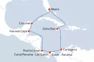 Itinerario : Miami, Ocho Rios, Cartagena, Canal Panama - Lac Gatun, Colon - Panama, Puerto Limon, Harvest Caye, Cozumel, Miami