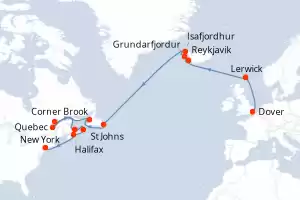 Itinerario : Dover, Lerwick, Reykjavik, Grundarfjordur, Isafjordhur, St Johns, Corner Brook, Quebec, Saguenay, Charlottetown, Sydney, Halifax, New York