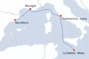 Itinerario : Barcellona, Marsiglia, Civitavecchia - Roma, La Valletta - Malta -
