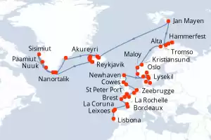 Itinerario : Lisbona, Leixoes, La Coruna, Bordeaux, La Rochelle, Brest, St Peter Port, Le Havre, Cowes, Portsmouth, Zeebrugge, Ijmuiden/Amsterdam, Newcastle upon Tyne, Newhaven, Kirkwall, Oslo, Lysekil, Copenhagen, Aarhus, Goteborg, Arendal, Haugesund, Maloy, Kristiansund, Tromso, Hammerfest, Honningsvag, Alta, Jan Mayen, Akureyri, Isafjordhur, Reykjavik, Nanortalik, Sisimiut, Nuuk, Paamiut, Prins Christians Sund, Tasiilaq, Siglufjordur - Islande, Isafjordhur, Grundarfjordur, Reykjavik