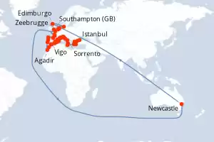 Itinerario : Southampton, Zeebrugge, Rotterdam, Ijmuiden/Amsterdam, Newcastle, Edimburgo, Amburgo, Le Havre, La Rochelle, Pauillac, Bilbao, La Coruna, Vigo, Porto, Lisbona, Agadir, Casablanca, Algeciras, Malaga, Cartagena, Ibiza, Mahon, Barcellona, Valencia, Palma di Maiorca, Alicante, Marsiglia, St Tropez, Monaco Monte-Carlo, Cinque Terre, Firenze/Pisa (Livorno), Civitavecchia - Roma, Sorrento, Catania, La Valletta - Malta -, Gythion, Milos, Pireo - Atene, Volos, Canakkale, Istanbul