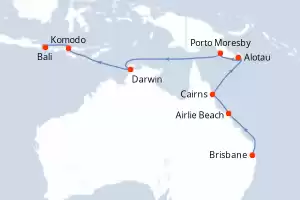 Itinerario : Papeete, Moorea, Raiatea, Bora Bora, Pago Pago, Apia, Suva, Lautoka, Port Vila, Lifou, Noumea, Pine Island Alaska, Bay of Island, Auckland, Tauranga, Napier, Wellington, Lyttelton, Dunedin, Dusky sound, Doubtfoul, Milford sound, Melbourne, Sydney, Newcastle, Brisbane