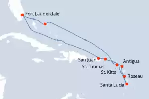 Itinerario : Fort Lauderdale, San Juan, St. Thomas, Antigua, Roseau, Santa Lucia, St. Kitts, Half Moon Cay, Fort Lauderdale