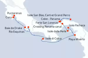 Itinerario : Colon - Panama, Fuerte San Lorenzo, Isole San Blas, Carti et Grand Perro, Crossing Panama canal, Isole delle Perle, Pacheca Island, Playa Muerto, Isole di Coiba, Rio Esquinas, Baie de Drake, Curu, Puntarenas