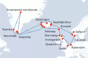 Itinerario : Rotterdam, Kristiansand, Eidfjord, Sandnes, Seydisfjordhur, Djupivogur, Akureyri, Isafjordhur, Grundarfjordur, Paamiut, Groenlandia meridionale, Nanortalik, Qaqortoq, Heimaey, Reykjavik, Runavik, Stornoway, Invergordon, Queensferry, Dover, Rotterdam