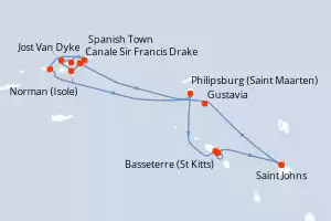 Itinerario : Saint Johns, Gustavia, Canale Sir Francis Drake, Norman (Isole), Jost Van Dyke, Sopers Hole, Spanish Town, Isole Virgine, Philipsburg (Saint Maarten), Basseterre (St Kitts), South Friar's Bay, Saint Johns