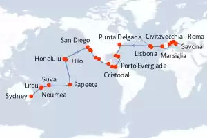 Itinerario : Civitavecchia - Roma, Savona, Marsiglia, Barcellona, Lisbona, Punta Delgada, Praia da vitoria, New York, Porto Everglade, Half Moon Cay, Cristobal, Puntarenas, Puerto Quetzal, Puerto Vallarta, Cabo San Lucas, San Diego, Los Angeles, San Francisco, Honolulu, Hilo, Papeete, Suva, Lifou, Noumea, Sydney