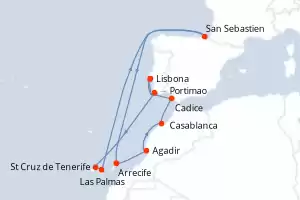 Portogallo, Spagna, Marocco Itinerario: Lisbona , Portimao , St Cruz de Tenerife , Las Palmas , San Sebastien , Arrecife , Agadir , Casablanca , Cadice , Lisbona Pensione completa Norwegian Star 11 giorni Cabina standard Lisbona 10/11/2025 da 1032 € Pensione completa Vedere le offerte