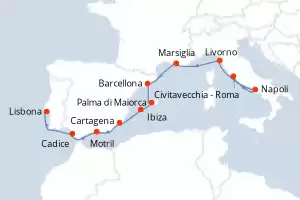 Italia,Francia,Spagna,Portogallo Itinerario: Civitavecchia - Roma , Napoli , Livorno , Marsiglia , Barcellona , Palma di Maiorca , Ibiza , Cartagena , Motril , Cadice , Lisbona Pensione completa Norwegian Viva 11 giorni Cabina con balcone Civitavecchia - Roma 18/11/2025 da 1149 € Pensione completa Partenza dall'Italia Vedere le offerte