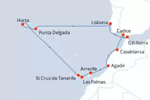 Portogallo,Spagna,Marocco,Regno Unito Itinerario: Lisbona , Punta Delgada , Horta , St Cruz de Tenerife , Las Palmas , Arrecife , Agadir , Casablanca , Cadice , Gibilterra , Lisbona Pensione completa Norwegian Sky 13 giorni Cabina standard Lisbona 12/11/2025 da 900 € Pensione completa Vedere le offerte