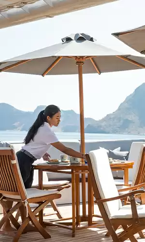 Il servizio a bordo è di un'attenzione impareggiabile, anticipando ogni desiderio degli ospiti. Generosi spazi abitativi, come ponti di osservazione all'aperto, sale proiezioni private e biblioteche, contribuiscono a creare un'atmosfera di lusso rilassato, favorevole allo scambio e alla contemplazione.