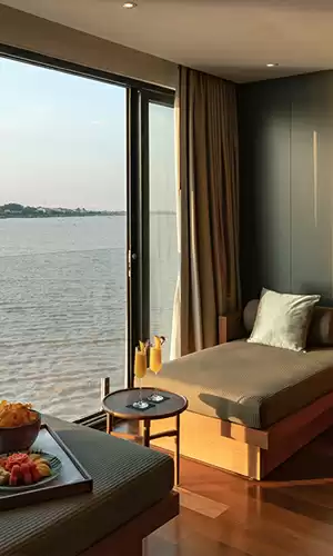 Le suite a bordo delle navi Aqua Expeditions, come l'Aqua Nera o l'Aqua Mekong, sono progettate per offrire una totale intimità senza mai interrompere il legame visivo con la natura. Ogni suite è un capolavoro di design, spesso decorata con artigianato locale di alto livello. La caratteristica principale rimane l'immensa parete vetrata che trasforma la camera in uno schermo cinematografico vivente sul mondo esterno. Dotate di bagni lussuosi, biancheria premium e, per alcune, balconi privati, queste suite garantiscono un riposo assoluto cullati dall'acqua, in un lusso discreto e accogliente.