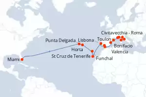 Itinerario : Civitavecchia - Roma, Bonifacio, Firenze/Pisa (Livorno), Cannes, Toulon, Barcellona, Valencia, Gibilterra, Siviglia, Lisbona, St Cruz de Tenerife, Funchal, Punta Delgada, Horta , Miami