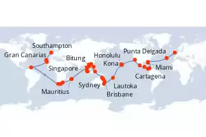 Itinerario : Southampton, Punta Delgada, Port Canaveral (Orlando), Miami, Cartagena, Canale di Panama, Puerto Quetzal, Manzanillo, Los Angeles, Kona, Honolulu, date, Lautoka, Sydney, Brisbane, Airlie Beach, Yorkeys Knob, Bitung, Manila, Hong Kong, Baia di Halong, Chan May, Laem Chabang, Singapore, Port Klang, Mauritius, Reunion Island, Durban, Port Elizabeth, Cape Town, Santo Vincenzo, Gran Canarias, Madera, Southampton