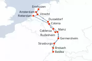 Paesi Bassi, Germania, Svizzera, Francia Itinerario: Colonia , Rotterdam , Enkhuizen , Amsterdam , Amsterdam , Utrecht , Dusseldorf , Coblenza , Rudesheim , Rudesheim , Germersheim , Strasburgo , Basilea , Basilea , Breisach , Mannheim , Colonia Pensione completa MS Rhein Melodie 12 giorni Cabina esterna Colonia 09/07/2026 da 1899 € Pensione completa Vedere le offerte