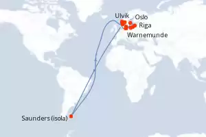 Danimarca, Norvegia, isole Malvine , Germania, Svezia, Lettonia, Polonia, Lituania Itinerario: Warnemunde , Ulvik , Kristiansand , Saunders (isola) , Oslo , Copenhagen , Warnemunde , Gdynia , Klaipeda , Riga , Stoccolma , Copenhagen , Warnemunde Pensione completa MSC Magnifica 15 giorni Cabina standard Warnemunde 26/07/2026 da 2159 € Bambini gratis fino a 12 anni Mini Club bambini gratis Msc Voyagers Club Animazione a bordo Pensione completa Altri porti d'imbarco : Copenhagen Vedere le offerte