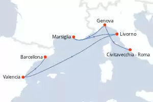 Italia, Spagna, Francia Itinerario: Civitavecchia - Roma , Genova , Marsiglia , Livorno , Valencia , Barcellona Pensione completa MSC Orchestra 7 giorni Cabina standard Civitavecchia - Roma 10/11/2025 da 319 € Bambini gratis fino a 12 anni Mini Club bambini gratis Msc Voyagers Club Animazione a bordo Pensione completa Partenza dall'Italia Vedere le offerte
