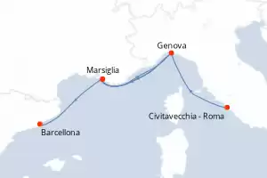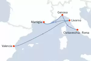 Italia, Spagna, Francia Itinerario: Civitavecchia - Roma , Genova , Marsiglia , Tarragona , Valencia , Livorno , Civitavecchia - Roma Pensione completa MSC Orchestra 8 giorni Cabina standard Civitavecchia - Roma 28/04/2026 da 609 € Bambini gratis fino a 12 anni Mini Club bambini gratis Msc Voyagers Club Animazione a bordo Pensione completa Partenza dall'Italia Altri porti d'imbarco : Genova Marsiglia Tarragona Valencia Altre partenze : 5-12-19-26 mag. 26 2-9-16-23-30 giu. 26 7-14-21-28 lug. 26 Altre partenze Vedere le offerte
