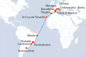 Argentina,Brasile,Marocco,Spagna,Francia,Italia Itinerario: Buenos Aires , Camboriú , Ilhabella , Rio de Janeiro , Maceio , St Cruz de Tenerife , Tangeri , Palma di Maiorca , Barcellona , Marsiglia , Genova , Civitavecchia - Roma Pensione completa MSC Fantasia 23 giorni Cabina standard Buenos Aires 23/03/2026 da 1789 € Bambini gratis fino a 12 anni Mini Club bambini gratis Msc Voyagers Club Animazione a bordo Pensione completa Vedere le offerte