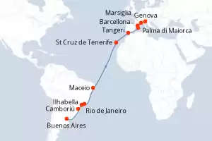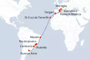 Argentina,Brasile,Marocco,Spagna,Francia,Italia Itinerario: Buenos Aires , Camboriú , Ilhabella , Rio de Janeiro , Maceio , St Cruz de Tenerife , Tangeri , Palma di Maiorca , Barcellona , Marsiglia , Genova Pensione completa MSC Fantasia 22 giorni Cabina con balcone Buenos Aires 23/03/2026 da 1959 € Bambini gratis fino a 12 anni Mini Club bambini gratis Msc Voyagers Club Animazione a bordo Pensione completa Vedere le offerte
