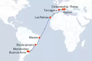 Uruguay,Argentina,Brasile,Spagna,Francia,Italia Itinerario: Montevideo , Buenos Aires , Rio de Janeiro , Maceio , Las Palmas , Tarragona , Ajaccio , Civitavecchia - Roma Pensione completa MSC Splendida 20 giorni Cabina standard Montevideo 30/03/2027 da 1429 € Bambini gratis fino a 12 anni Mini Club bambini gratis Msc Voyagers Club Animazione a bordo Pensione completa Vedere le offerte