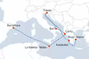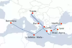 Spagna,Malta,Grecia,Italia,Turchia Itinerario: Barcellona , La Valletta - Malta - , Corfu , Bari , Trieste , Katakolon , Pireo - Atene , Izmir , Istanbul Pensione completa MSc Fantasia 12 giorni Suite Barcellona 27/04/2026 da 3429 € Animazione a bordo Pensione completa Vedere le offerte