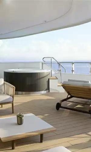 L’allogio costituisce uno dei punti di forza dell’esperienza. Gli yachts della collezione sono composti esclusivamente da suite, tutte dotate di una terrazza privata con vista sul mare. Questi spazi, generosi e inondati di luce, sono stati pensati per prolungare la sensazione di evasione fino all’intimità della cabina. L’arredo unisce eleganza contemporanea, comfort residenziale e finiture di alta gamma, in uno spirito che richiama gli indirizzi più prestigiosi di Ritz-Carlton. L’insieme crea un’atmosfera di residenza privata sul mare, ideale per godere di un viaggio all’insegna della serenità.