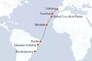 Portogallo, Brasile, Capo Verde, Spagna Itinerario: Lisbona , Funchal , Funchal , Santa Cruz de la Palma , Mindelo , Recife , Salvador di Bahia , Rio de Janeiro , Rio de Janeiro Pensione completa Silver Whisper 19 giorni Suite Lisbona 28/11/2025 da 4050 € Pensione completa Vedere le offerte