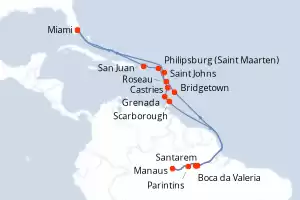 Stati uniti, Portorico, Grenada, Brasile, La Trinidad eTobago, Barbados Itinerario: Miami , Bridgetown , Port of Spain , Santarem , Boca da Valeria , Manaus , Parintins , Alter do Chao , Grenada , San Juan , Miami Pensione completa Seven Seas Mariner 23 giorni Suite Miami 09/11/2026 da 11159 € Escursioni illimitate offerte Ristoranti di specialità inclusi Mance incluse Pre-notte in hotel offerta Bevande Premium incluse Servizio lavanderia incluso Pensione completa Vedere le offerte