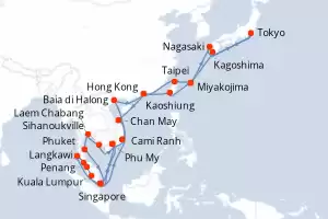 Gran Aventura Asiática Itinerario: Tokyo , Kagoshima , Okinawa , Kaoshiung , Hong Kong , Chan May , Phu My , Singapore , Kuala Lumpur , Penang , Langkawi , Phuket , Phu My , Sihanoukville , Laem Chabang , Laem Chabang , Ko Samui , Singapore , Cami Ranh , Baia di Halong , Baia di Halong , Baia di Halong , Hong Kong , Taipei , Miyakojima , Nagasaki , Tokyo Pensione completa Sapphire princess 43 giorni Cabina standard Tokyo 12/12/2026 da 4224 € ESPERIENZA PREMIUM Pensione completa Vedere le offerte