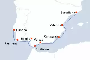 Spagna, Regno Unito, Portogallo Itinerario: Barcellona , Valencia , Cartagena , Malaga , Gibilterra , Siviglia , Siviglia , Siviglia , Portimao , Lisbona Pensione completa Azamara Quest 10 giorni Cabina standard Barcellona 14/11/2026 da 3049 € tutto incluso RISTORAZIONE GASTRONOMICA Servizio impeccabile Bevande All-Inclusive Mance incluse AzAmazing Evenings Incluso Pensione completa Vedere le offerte