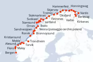 Norvegia Itinerario: Bergen , Floro , Maloy , Torvik , Alesund , Molde , Kristiansund , Trondheim , Rorvik , Bronnoysund , Sandnessjoen , Nesna (passaggio cerchio polare) , Ornes , Bodo , Stamsund , Svolvaer , Stokmarknes , sortland , Risoyhamn , Harstad , Finnsnes , Tromso , Skjervoy , Oksfjord , Hammerfest , Havoysund , Honningsvag , Kjollefjord , Mehamn , Berlevag , Batsfjord , Vardo , Vadso , Kirkenes , Vardo , Batsfjord , Berlevag , Mehamn , Kjollefjord , Honningsvag , Havoysund , Hammerfest , Oksfjord , Skjervoy , Tromso , Finnsnes , Harstad , Risoyhamn , sortland , Stokmarknes , Svolvaer , Stamsund , Bodo , Ornes , Nesna (passaggio cerchio polare) , Sandnessjoen , Bronnoysund , Rorvik , Trondheim , Kristiansund , Molde , Alesund , Torvik , Maloy , Floro , Bergen Pensione completa MS Nordnorge 14 giorni Cabina standard Bergen 02/02/2027 da 4398 € Pensione Completa Cucina Norvegese e Internazionale Sicurezza e rispetto dell'ambiente Equipaggio Esperto Specialista dei fiordi e zone polari Vedere le offerte