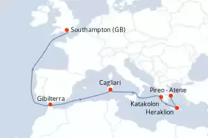 Italia, Grecia, Regno Unito Itinerario: Pireo - Atene , Heraklion , Katakolon , Cagliari , Gibilterra , Southampton Pensione completa Queen Anne 11 giorni Cabina standard Pireo - Atene 29/09/2026 da 1670 € Eleganza Britannica Nave Leggendaria Servizio in camera 24 ore su 24 Pensione completa Vedere le offerte