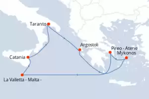 Grecia, Malta, Italia Itinerario: Tarente , Argostoli , Mykonos , Pireo - Atene , La Valletta - Malta - , Catania , Tarente Pensione completa Costa Fascinosa 8 giorni Cabina standard Tarente 06/09/2026 da 1029 € Bambini Gratis Mini Club bambini gratis Tariffe Suite Deluxe All Inclusive disponibile Pensione completa Altri porti d'imbarco : Catania Pireo - Atene Altre partenze : 7-14-21-28 giu. 26 5-12-19-26 lug. 26 2-9-16-23-30 ago. 26 Vedere le offerte
