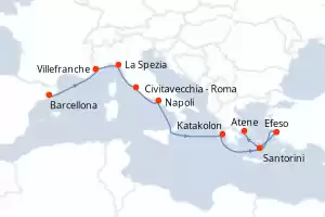 Grecia, Turchia, Italia, Francia, Spagna Itinerario: Barcellona , Villefranche , La Spezia , Civitavecchia - Roma , Napoli , Katakolon , Efeso , Santorini , Pireo - Atene Pensione completa Celebrity Eclipse 12 giorni Cabina standard Barcellona 07/09/2026 da 1094 € All Included disponibile Crociere di Lusso Pensione completa Vedere le offerte