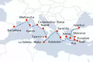 Grecia, Turchia, Spagna, Francia, Italia, Malta, Albania Itinerario: Pireo - Atene , Mykonos , Istanbul , Istanbul , Kusadasi , Kos , Rodi , Pireo - Atene , Katakolon , Saranda , La Valletta - Malta - , Taormina , Napoli , Civitavecchia - Roma , Ajaccio , Villefranche , Barcellona Pensione completa MS Oosterdam 22 giorni Cabina standard Pireo - Atene 14/10/2026 da 3749 € Cucina raffinata Intrattenimento esclusivo a bordo Esperienza Premium Pensione completa Vedere le offerte