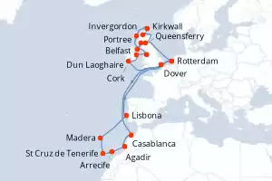 Regno Unito, Marocco, Irlanda, Paesi Bassi, Portogallo, Spagna Itinerario: Rotterdam , Casablanca , Agadir , Arrecife , St Cruz de Tenerife , Madera , Lisbona , Dover , Rotterdam , Queensferry , Invergordon , Kirkwall , Portree , Belfast , Greenock , Liverpool , Dun Laoghaire , Cork , Dover , Rotterdam Pensione completa Nieuw Statendam 29 giorni Cabina standard Rotterdam 17/04/2027 da 4619 € Cucina raffinata Intrattenimento esclusivo a bordo Esperienza Premium Pensione completa Altri porti d'imbarco : Dover Vedere le offerte