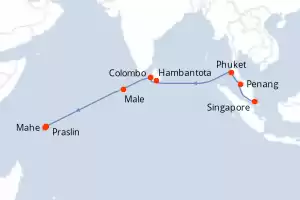 Itinerario : Singapore, Penang, Phuket, Hambantota, Colombo, Male, Praslin, Mahe, Singapore, Penang, Phuket, Hambantota, Colombo, Male, Praslin, Mahe