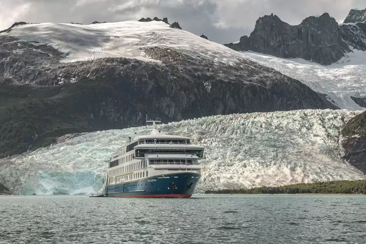 La Baia di Ainsworth, in Cile, è un must delle crociere in Patagonia. Si trova nel Parco Nazionale Alberto de Agostini, dove i ghiacciai cadono in acque color smeraldo. È un luogo ideale per osservare leoni marini e cormorani e per fare escursioni ai punti di osservazione dei ghiacciai. La baia offre una tranquillità mozzafiato, interrotta solo dal rumore del ghiaccio in movimento.