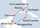 "Capitale della provincia eponima, Cienfuegos è situata a 228 km al Sud-Est dell'avana, a Cuba. La sua posizione in fondo ad una delle più belle baie del mare dei Caraibi gli vale la denominazione ""di perla del Sud,,. Cienfuegos è anche un terminale portuale che dispone delle infrastrutture più moderne per l'accoglienza di vari tipi di navi, che vanno dalle semplici unità di piacere alle superpetroliere immense. In occasione degli scali di crociere Cienfuegos, i villeggiante visitano il centro storico, il luogo di nascita del musicista Benny Moré e il giardino botanico immenso Soledad che fa la sua reputazione. I suoi 97 ettari di terra servono alla piantagione di più del 2000 specie di piante esotiche tropicali, fra cui orchidee, palme, bambù e ficus. Durante una fermata di crociera Cienfuegos, appassionati di immersioni sottomarine se li lanciano nell'esplorazione della barriera di corallo Notre Dame."