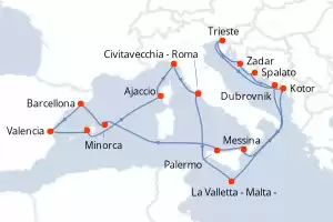 Spagna,Italia,Francia,Malta,Croazia,Grecia Itinerario: Civitavecchia - Roma , La Spezia , Barcellona , Alghero , Ajaccio , Civitavecchia - Roma , La Valletta - Malta - , Spalato , Zadar , Trieste , Dubrovnik , Corfu , Cefalonia , Messina , Napoli , Civitavecchia - Roma Pensione completa Queen Elizabeth 22 giorni Cabina standard Civitavecchia - Roma 23/07/2027 da 3940 € Eleganza Britannica Nave Leggendaria Servizio in camera 24 ore su 24 Pensione completa Partenza dall'Italia Altri porti d'imbarco : Trieste Vedere le offerte
