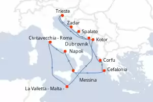 Italia, Francia, Malta, Croazia, Montenegro, Grecia Itinerario: Civitavecchia - Roma , Messina , Cefalonia , Corfu , Kotor , Spalato , Trieste , Zadar , Dubrovnik , La Valletta - Malta - , Napoli , Civitavecchia - Roma , Marsiglia , Villefranche , Genova , La Spezia , Civitavecchia - Roma Pensione completa Queen Victoria 22 giorni Cabina standard Civitavecchia - Roma 29/06/2026 da 3410 € Eleganza Britannica Nave Leggendaria Servizio in camera 24 ore su 24 Pensione completa Partenza dall'Italia Vedere le offerte