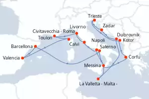 Grecia, Croazia, Italia, Montenegro, Malta, Francia, Spagna Itinerario: Civitavecchia - Roma , Barcellona , Marsiglia , Calvi , La Spezia , Civitavecchia - Roma , La Valletta - Malta - , Kotor , Spalato , Zadar , Trieste , Dubrovnik , Corfu , Cefalonia , Messina , Napoli , Civitavecchia - Roma Pensione completa Queen Elizabeth 22 giorni Cabina standard Civitavecchia - Roma 02/07/2027 da 3700 € Eleganza Britannica Nave Leggendaria Servizio in camera 24 ore su 24 Pensione completa Partenza dall'Italia Altri porti d'imbarco : Trieste Vedere le offerte