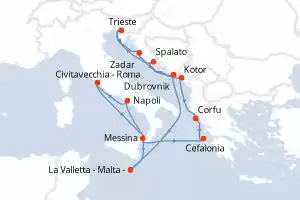 Italia, Malta, Croazia, Montenegro, Grecia Itinerario: Civitavecchia - Roma , Messina , Cefalonia , Corfu , Kotor , Spalato , Trieste , Zadar , Dubrovnik , La Valletta - Malta - , Napoli , Civitavecchia - Roma Pensione completa Queen Victoria 15 giorni Cabina standard Civitavecchia - Roma 29/06/2026 da 2330 € Eleganza Britannica Nave Leggendaria Servizio in camera 24 ore su 24 Pensione completa Partenza dall'Italia Vedere le offerte